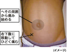 最初はおへその周りから痛くなり、半日から1日と時間が経っていくうちに右の下腹部 (おへそと腸骨の間) へと痛みの場所が移っていきます。