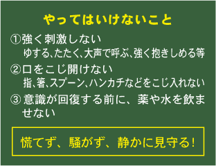 早くよくしてやろうと、けいれん予防の薬やてんかんの薬、水分をとらせようとすると、誤嚥したり窒息や嘔吐の原因になります。