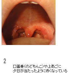 口蓋垂やその周囲の軟口蓋が赤く腫れたり、点々と出血斑が見られます。