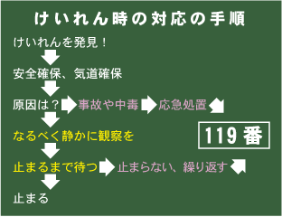 落ち着くこと、安全確保、気道確保、原因の判断、緊急性の判断、必要なら救急車の要請、発作の観察、これらのことを順々に行動に移せるように、実際の場面を想定して、シミュレーションしておいて下さい。