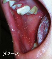 ほっぺたの内側の粘膜 (特に奥歯の付近)に点状の白い発疹が無数に認められます