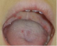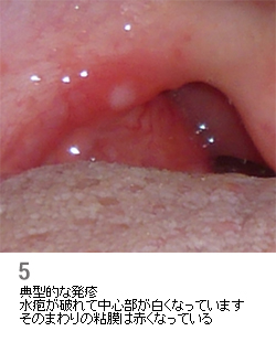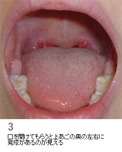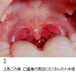 写真のような発疹を上あごに見つければ、すぐにヘルパンギーナとわかります。