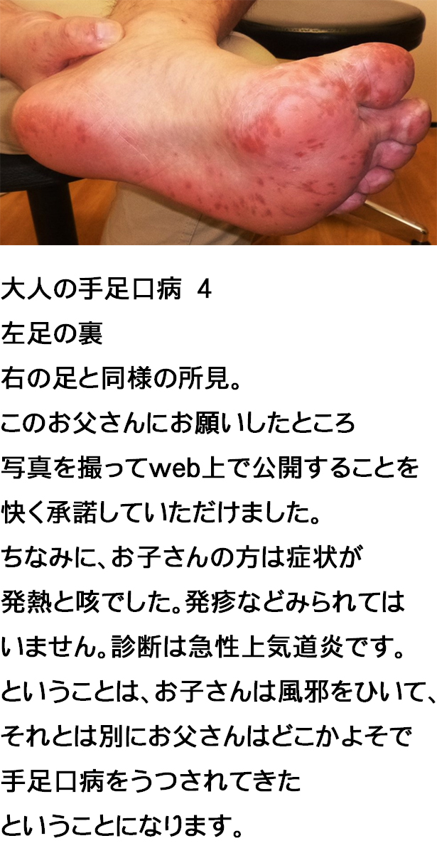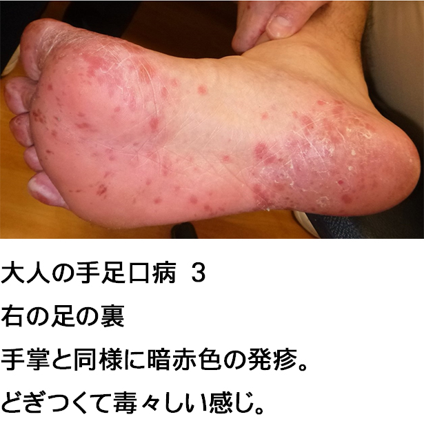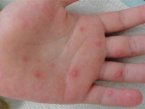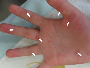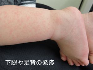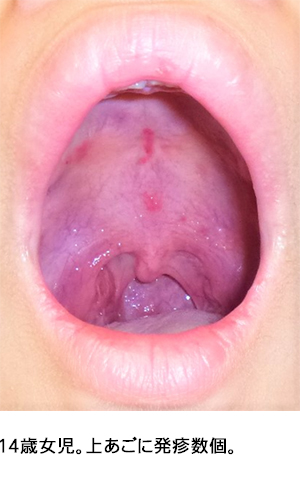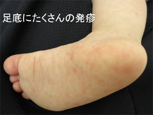 特徴的な発疹が手のひらや足のうら、その周辺にもまばらに現れ、見ただけで診断できます。