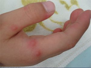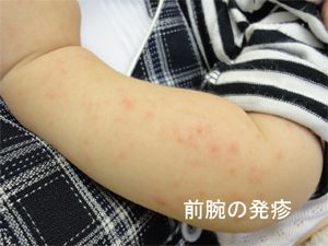 特徴的な発疹は、中心部の大きさが数㎜~1㎝弱で、わずかに平たく盛り上がっています (写真右) 。