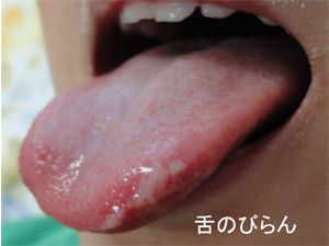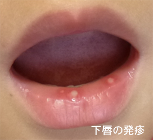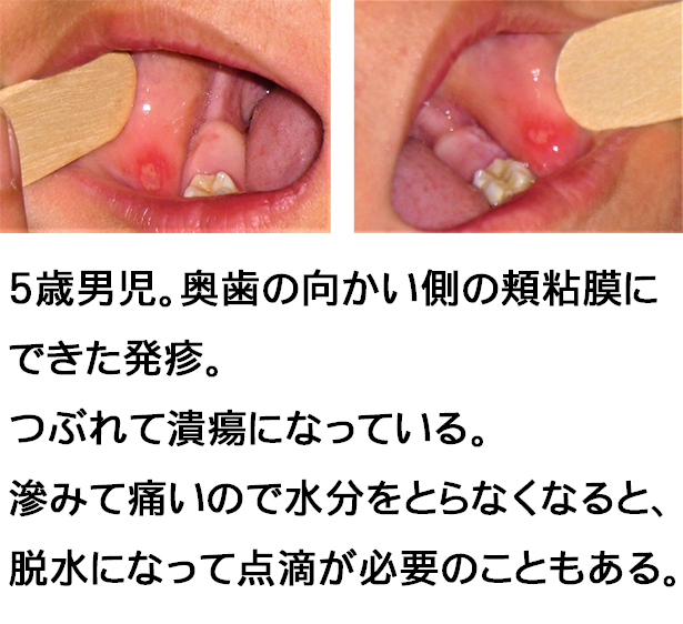 口の中にも紅斑、水疱、潰瘍を形成します。