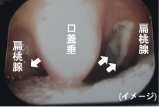 アデノウイルス感染症では、膿が付くほかに口蓋垂や軟口蓋も赤く腫れます。