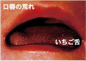 口唇が赤くなってひび割れます。口の中の粘膜が赤くなり、舌も全体が赤くなり舌乳頭が腫大していちご舌となります。