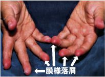 薄く細かくはがれる場合と分厚く膜様に広範囲にはがれる場合 (膜様落屑、右の写真) と、