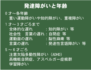 よって、発達の障がいに気が付かれる年齢は、その障がいの種類によって大まかに決まっています。